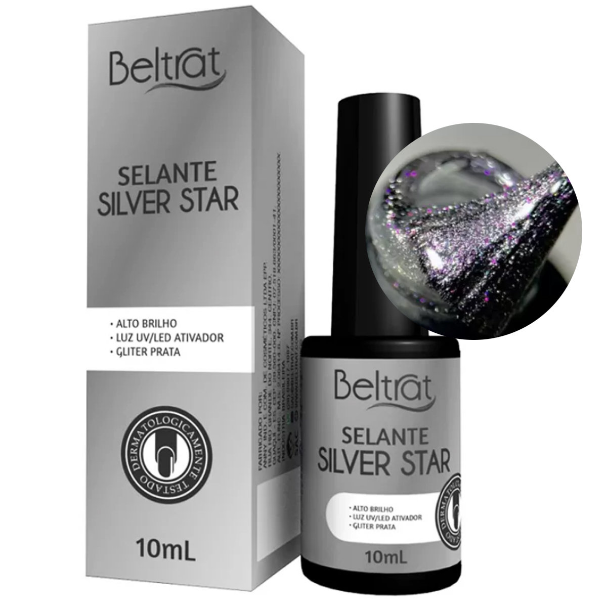 É o finalizador com glitter prata, responsável por proporcionar um alto brilho e melhor acabamento nas unhas artificiais. Com brilho mais intenso e acabamento perfeito o Selante da Beltrat não possui goma, não havendo a necessidade de limpar, apenas espere 30 segundos para tocar nas unhas. Produto dermatologicamente testado e hipoalergênico.